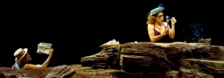 Con una puesta enescena llena de rocas y arena que simula una especie de desierto, una Winnie enterrada primero hasta la cintura y después hasta el cuello, colocada a la altura de los espectadores centrales, se muestra alegre y optimista ante la rutina y trata de sobrevivir, distrayéndose con los múltiples objetos que hay dentro de su preciada bolsa, ante las adversidades de su entorno y la mínima compañía de su querido Willie, el papel de Òscar Molina.