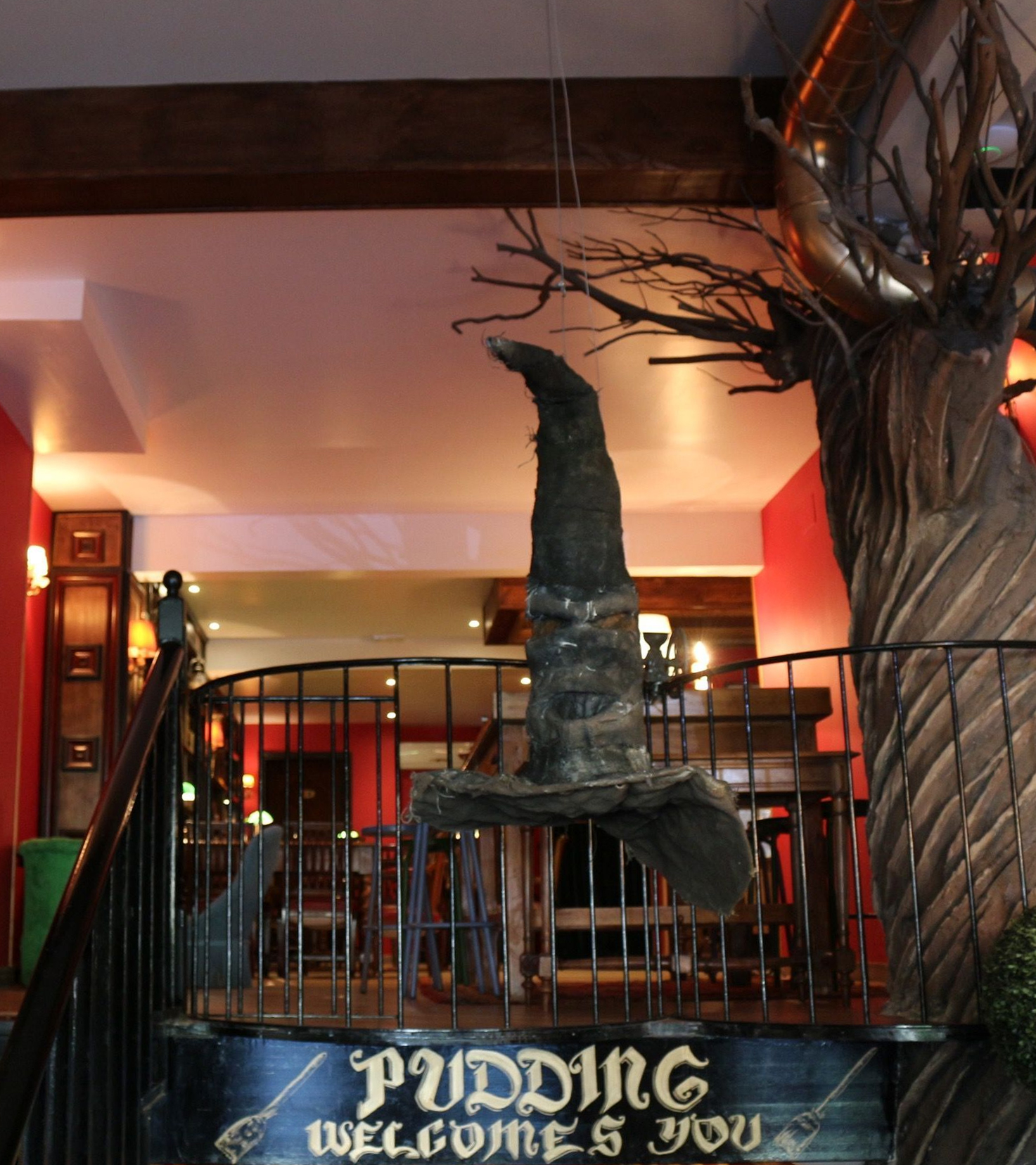 El restaurante está dividido en tres plantas, cada una de ellas decorada con todos los detalles que evocan a Hogwarts y sus distintas escuelas: estantes repletos de libros, banderines, el sombrero seleccionador, mobiliario antiguo de madera, etc. En la zona central se encuentra el obrador, una barra donde se exhiben las tartas, las quiches y la gran variedad de zumos naturales que preparan a diario. Es el lugar ideal para tomar un café rápido en alguna de sus mesas.