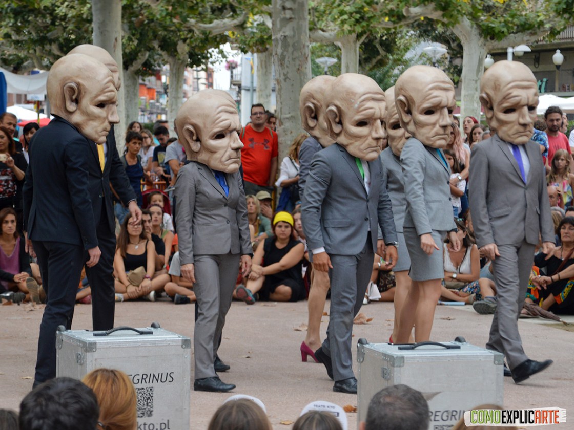La vida en la ciudad también la analizan, de otra manera, los polacos Teatr KTO. Con su show itinerante Peregrinus critican el consumismo. Visten con traje y se enfundan en unas máscaras cabezudas que les convierten en personas frías, influenciables y sin personalidad. La vida laboral es gris como su ropa y su equipaje, igual que lo son el cielo y el asfalto. La actualidad es dura dentro y fuera del trabajo. Otra de las favoritas entre las que pudimos ver este año.
