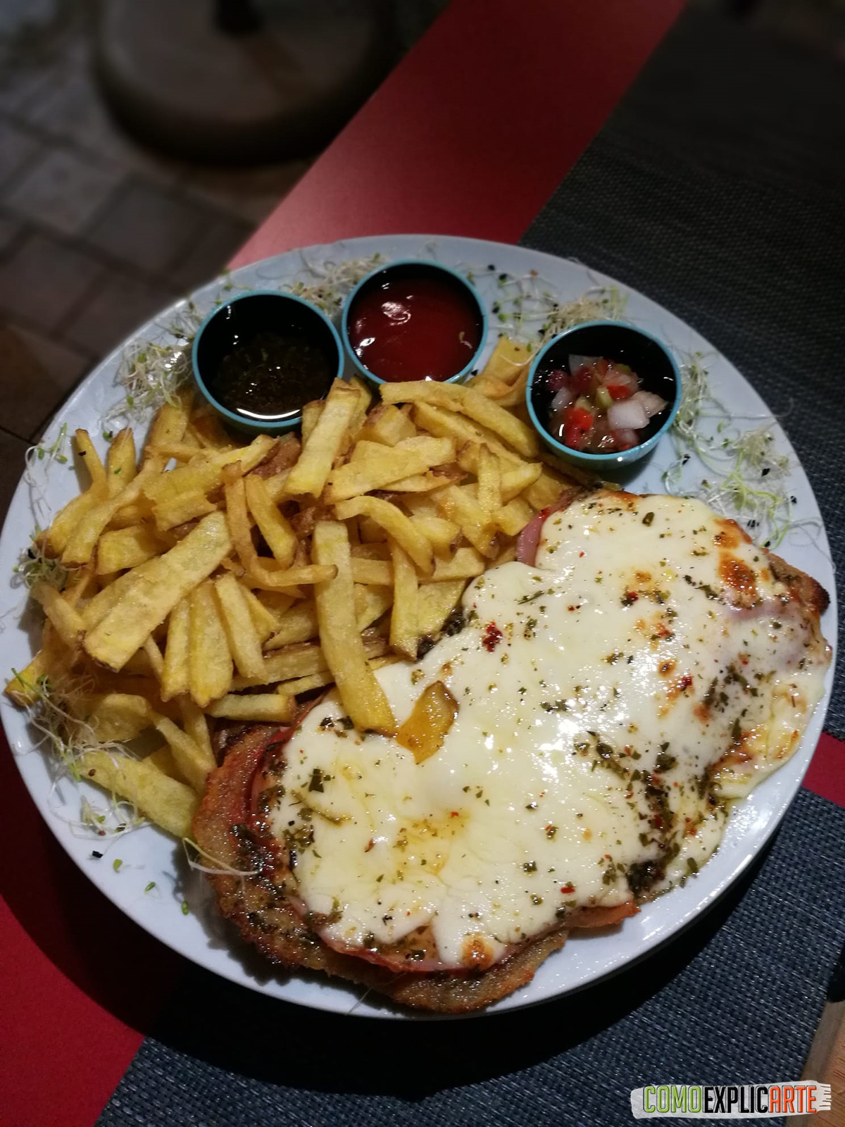 Nosotros optamos por buscar la esencia argentina. Pedimos un par de empanadas de carne criolla (caseras, claro) y una cazuelita de provolone con tomates secos y rúcula realmente gustosa. Para rematar, dimos paso a la Milanesa napolitana; en este caso de ternera (también tienen de pollo) con salsa de tomate, jamón cocido y mozzarella. Si ya es contundente de por sí, le añaden el acompañamiento de patatas fritas y salsas kétchup, criolla y chimichurri para disfrutar como es debido y chuparse los dedos.