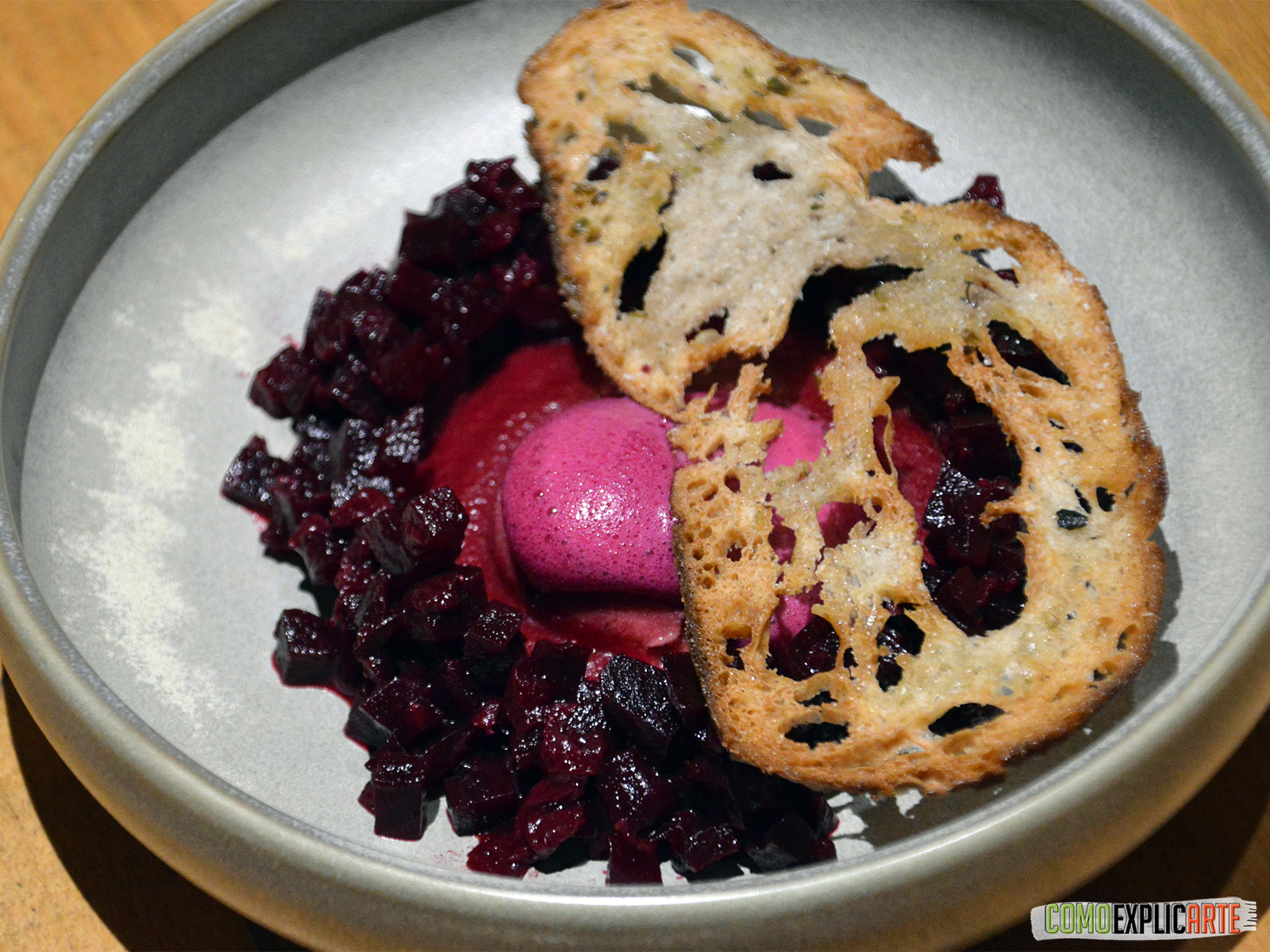 Nosotros cenamos y pedimos un entrante, un plato principal y un postre cada uno. Acabamos con el estómago lleno, pero sin remordimientos. De las tapas probamos el Tartar de remolacha, fresas y ciruelas fermentadas (plato muy refrescante, servido con una tosta de pan y con una textura que se deshace en boca) y el Huevo a baja temperatura con Heura y topinambur (una mezcla suave y sabrosa).