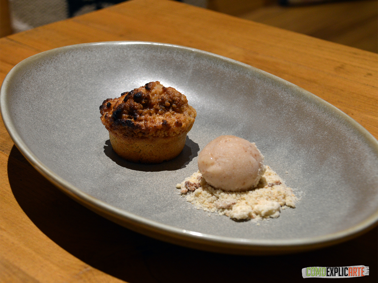 Los postres brillan por su originalidad. Elegimos el Vegan apple pie con sorbete de manzana asada y canela (presentado como un muffin esponjoso con compota de manzana) y el Cheesecake crudivegano de té matcha y anacardos (perfecto para los fans del matcha).