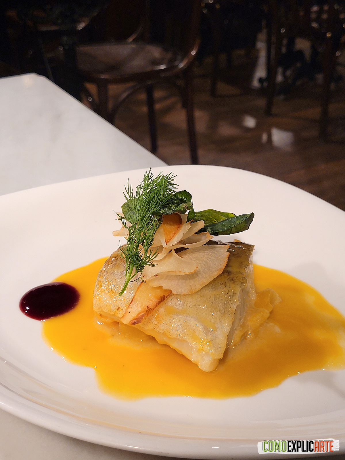 De segundo elegimos un arroz cremoso de setas de temporada con extracto de trufa y parmesano; y el bacalao con salsa de naranja sanguiña, manzana asada, chips de espinacas y yuca. Dos platos elaborados de forma profesional con una presentación elegante y la ración justa para llenar el estómago sin pasarse.