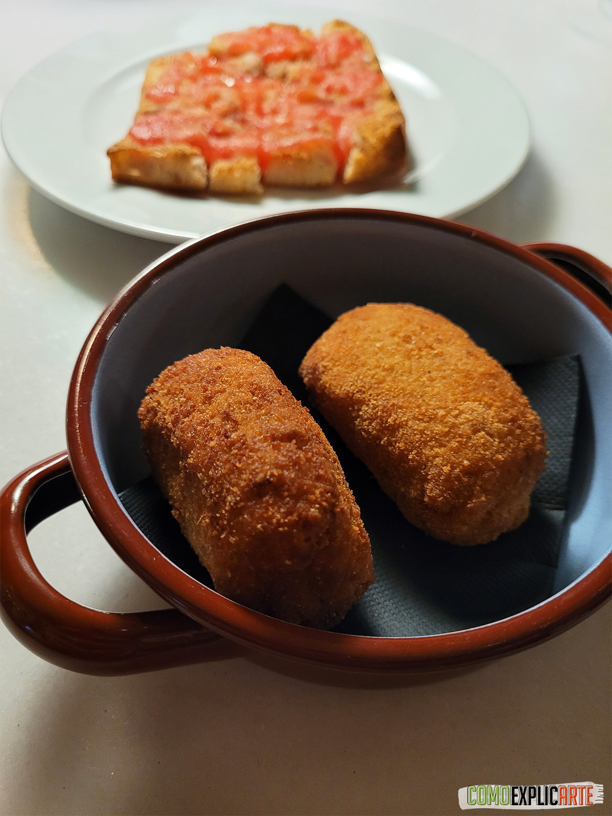 El pan con tomate es crujiente y va bien untado con AOVE. Para ir abriendo boca nos sirvieron unos Mejillones rellenos de ricota y tomate confitado. Muy originales a modo picoteo. Después vinieron un par de Croquetas de cocido, de gran tamaño y muy jugosas. Pasamos a uno de los platos más llamativos: las Galletas de “socarrat” de risotto. Es, tal como el nombre indica, un risotto de setas que dejan tostar hasta que queda compacto. El sabor es intenso y la textura recuerda claramente a una galleta.