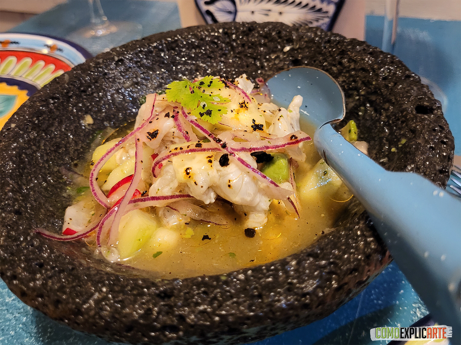 El Tiacoyo de maíz azul con nopal fresco ecológico asado, frijoles charros y queso de rancho también nos convenció por su textura y su contraste de sabores. Y qué decir del Aguachile de Sinaloa (Ceviche de gambas con cebolla morada, pepino, limón y sal) en molcajete de piedra volcánica… ¡Cuidan el más mínimo detalle de las presentaciones!