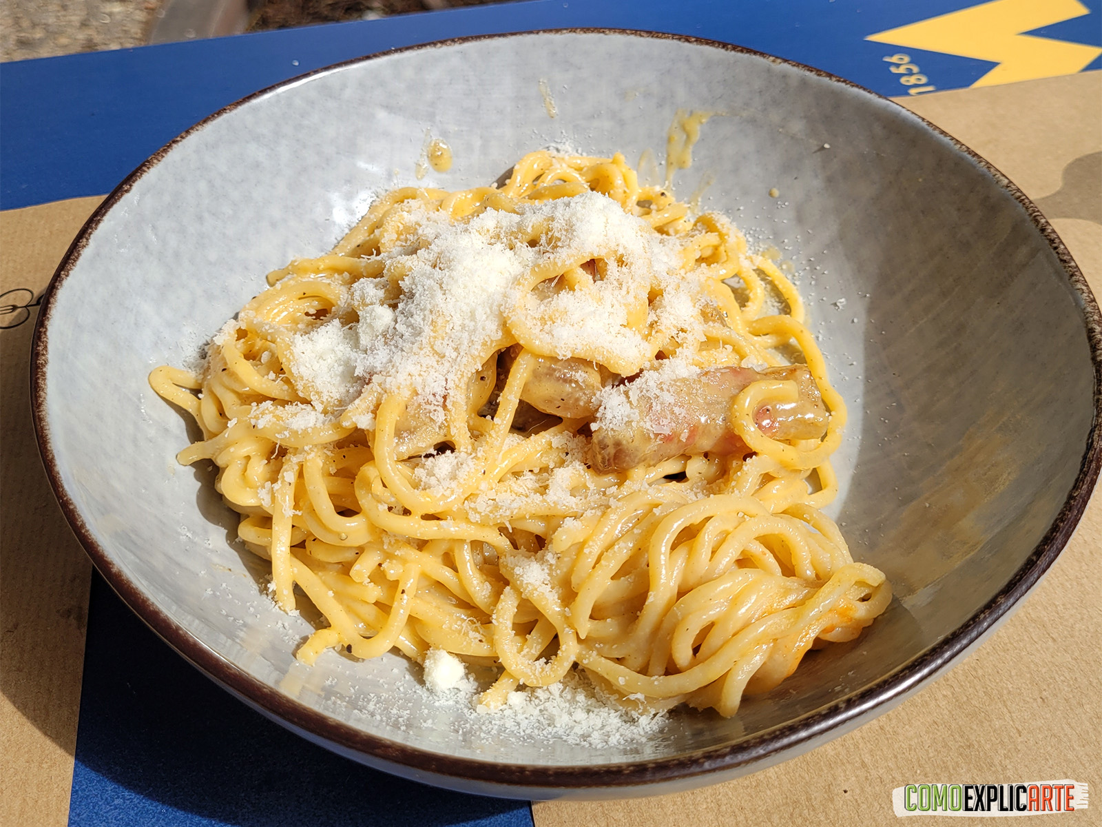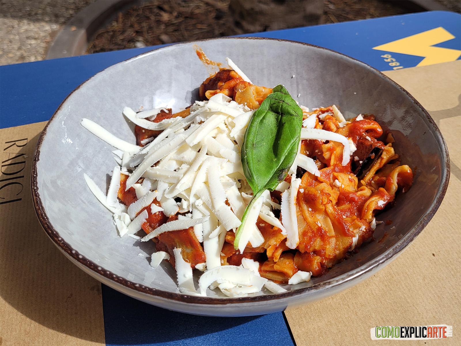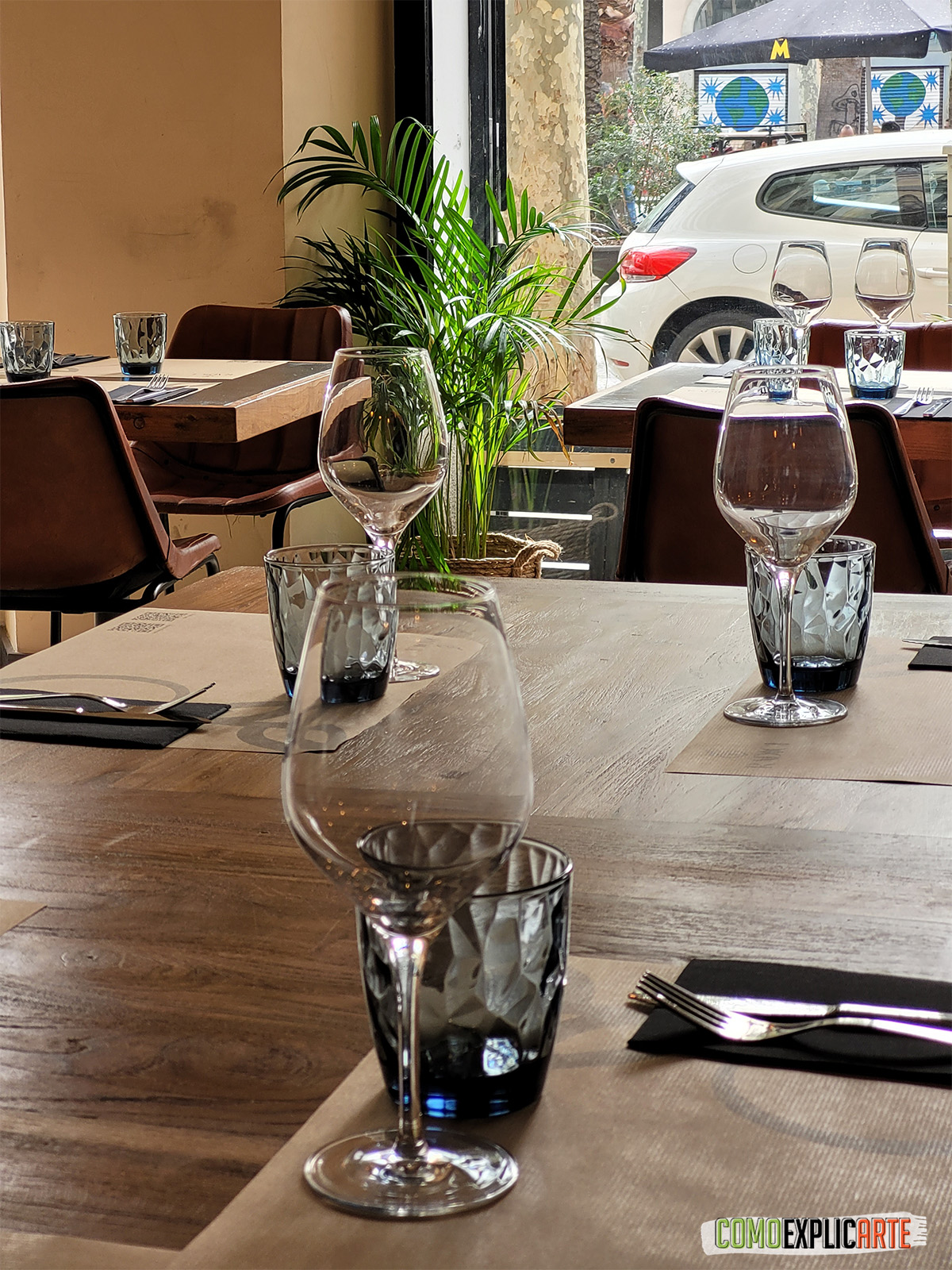 Desde fuera se ve como preparan de forma artesanal la pasta fresca en su obrador, y aunque la entrada quizá no sea lo más atractivo, al fondo hay un salón interior, luminoso y moderno donde comer tranquilamente. Nosotros optamos por la terraza para aprovechar un día de Sol. A parte de bruschettas, pastas caseras y pinsas (más crujientes y digeribles comparando con las clásicas pizzas debido a la alta hidratación y fermentación de la masa durante 72 horas), tienen otros platos que recomendamos.