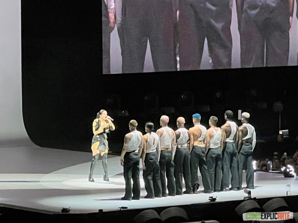 Una moto quemando rueda, el zumbido de cualquier motor, y un escenario al estilo “caja de luz” que simboliza una pista de despegue. En el centro ella, Rosalía, rodeada por ocho bailarines. Todos ellos merecen una mención por su impecable trabajo. Bravo Sam Vázquez, Eddy Soares, Jaxon Willard, Antonio Spinelli, Stanley Glover, Óscar Ramos, Daniel Muñoz y Mykee. Eso sí, actúan sin músicos sobre el escenario, sin El Guincho disparando bases, y con tan solo un teclista que acompaña a Rosalía desde las sombra. Arranca el show y se nos presenta la nueva era de la cantante y compositora catalana. Sin artificios, pero como si atravesaras la cuarta pared.