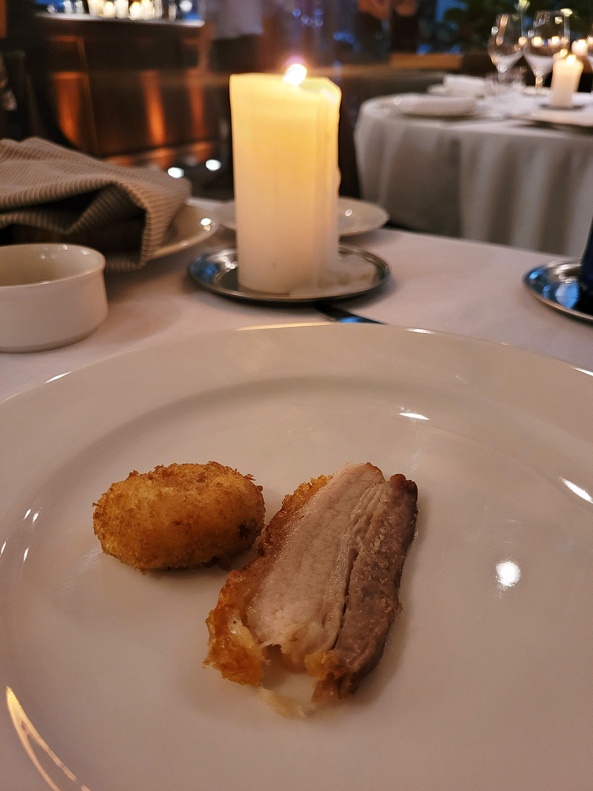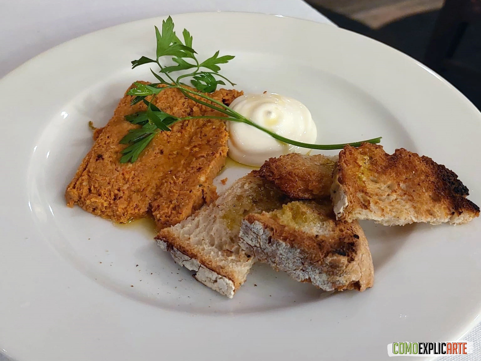 Nuestra cena comenzó con un aperitivo sugerente formado por pan a la brasa, aceitunas, un par de croquetas de leche y un par de torreznos para abrir boca. Acto seguido llegó el pastel de cabracho, suave pero delicioso con unas tostadas de pan; y el crudo de pez limón, o lo que sería una especie de carpaccio cítrico y muy meloso.