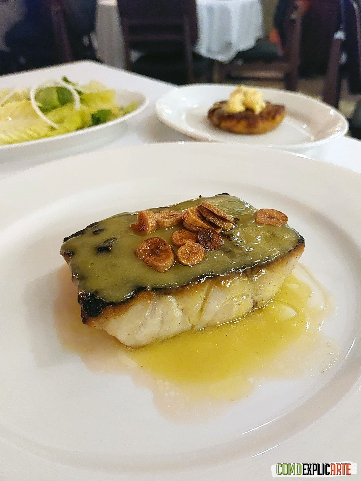 Continuamos con la famosa tortilla de patatas con cebolla, la cual nos sirvieron con total delicadeza en el plato justo antes de pasar a los principales: pescado y carne. Por un lado, probamos la corvina a la brasa. Por otro lado, el lomo bajo de vaca madurada. Ambos espectacularmente bien cocinados, preparados y presentados. Así da gusto.