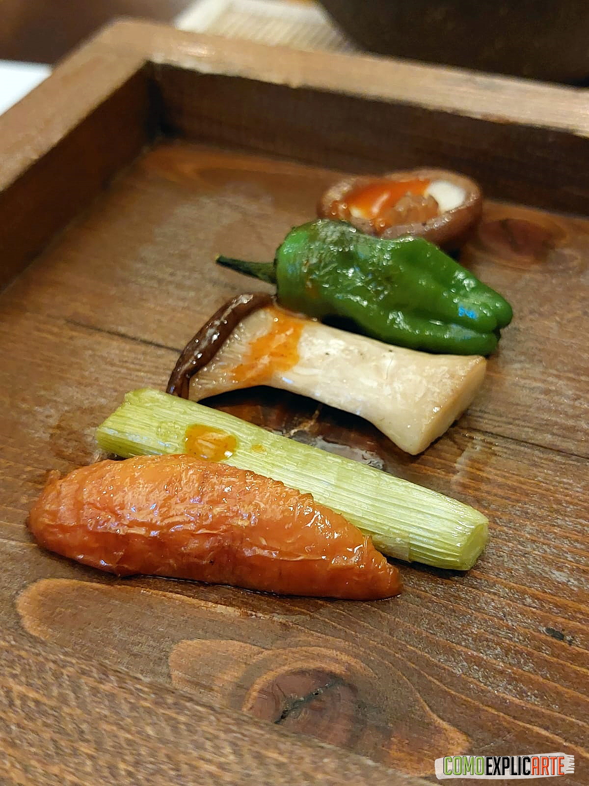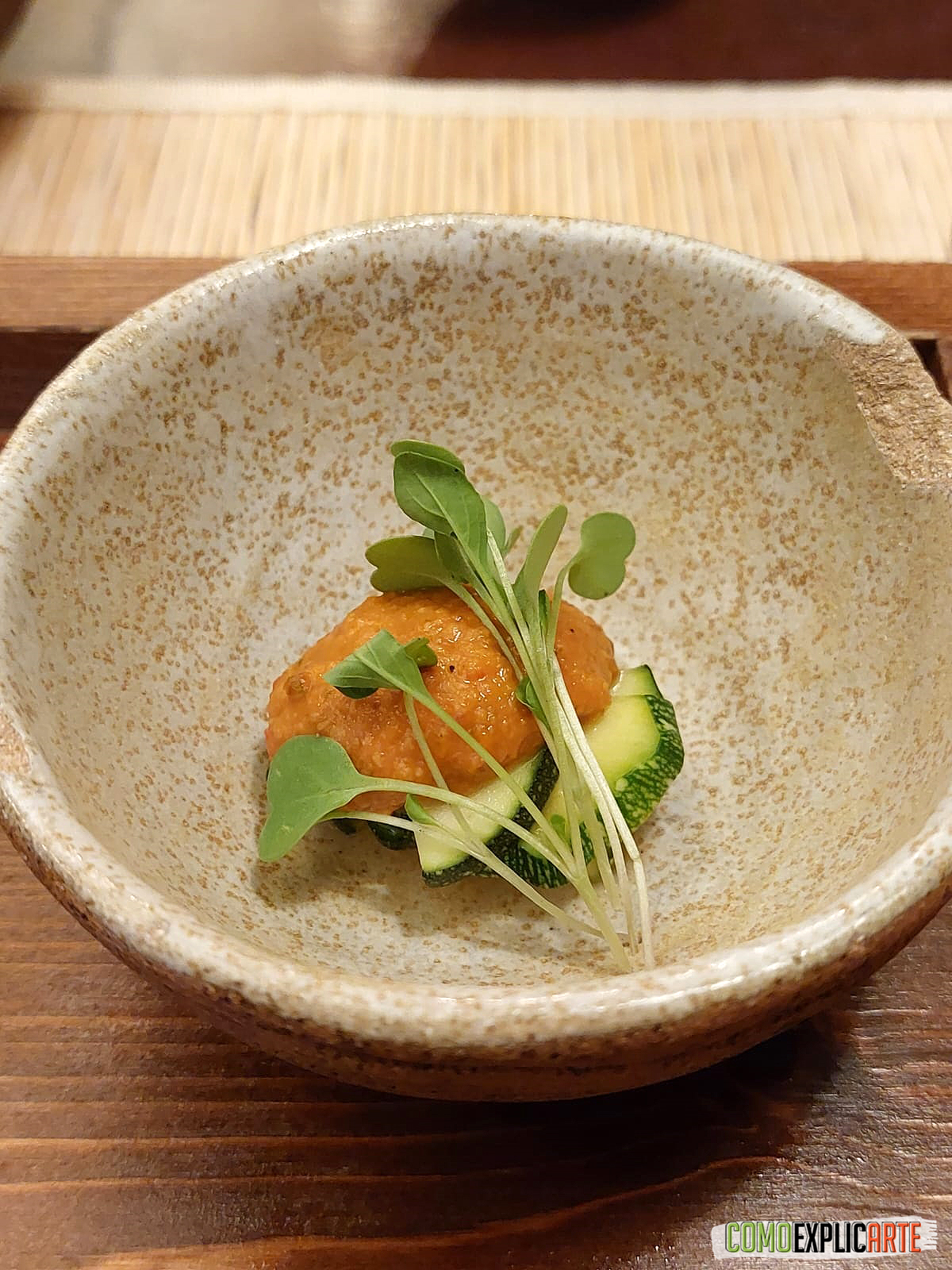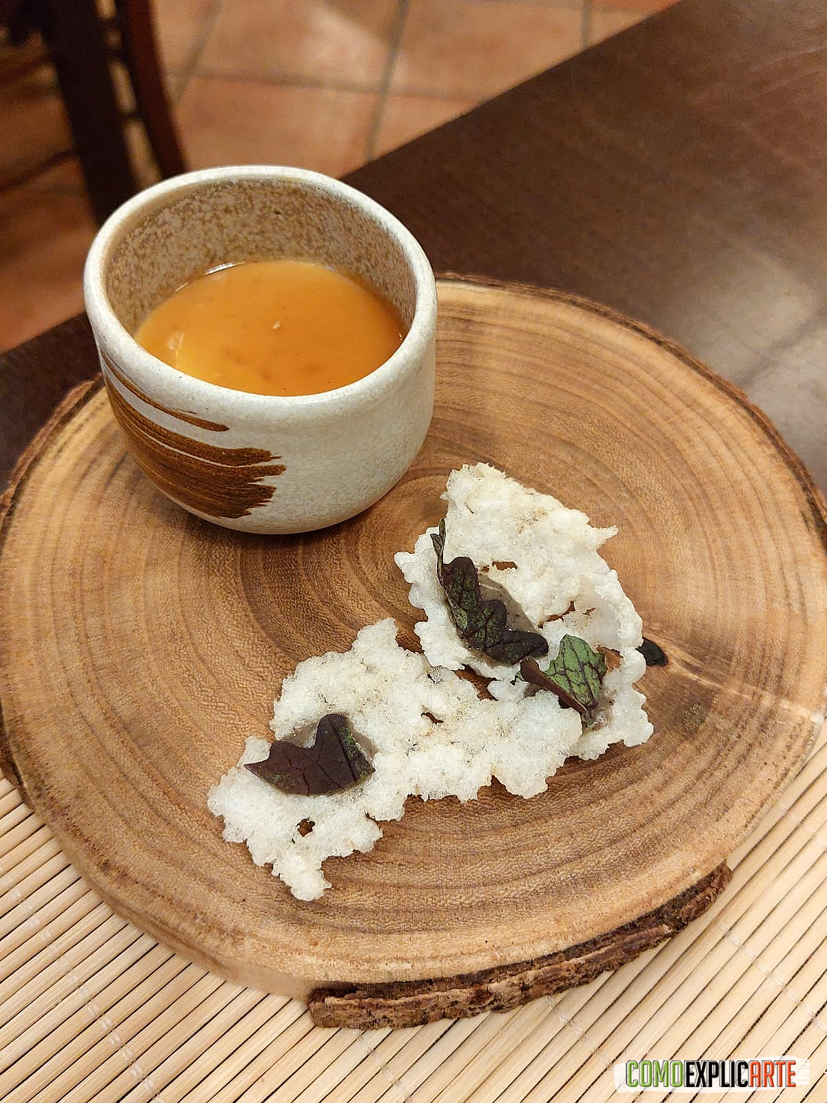 Nosotros elegimos el menú completo (40€) para recorrer el viaje entero por la cocina kaiseki con raíces locales. Comenzamos con un ‘Chawanmushi’ a modo de entrante. Es una mezcla de huevo y dashi que junto con varios ingredientes se cocina al vapor y se sirve en cuenco o taza de té. Típico de Japón pero en este caso adaptado con tomate y sembei.