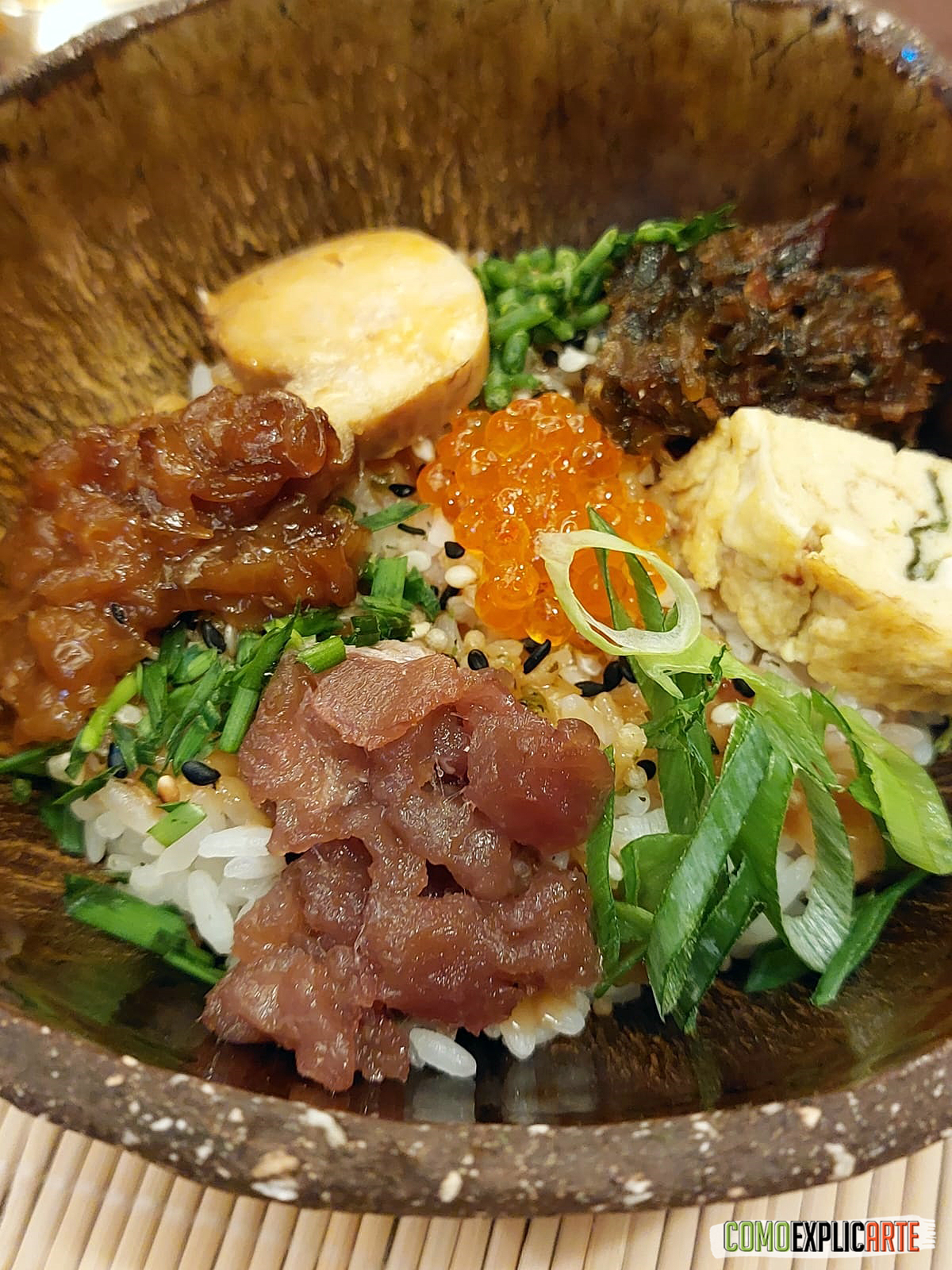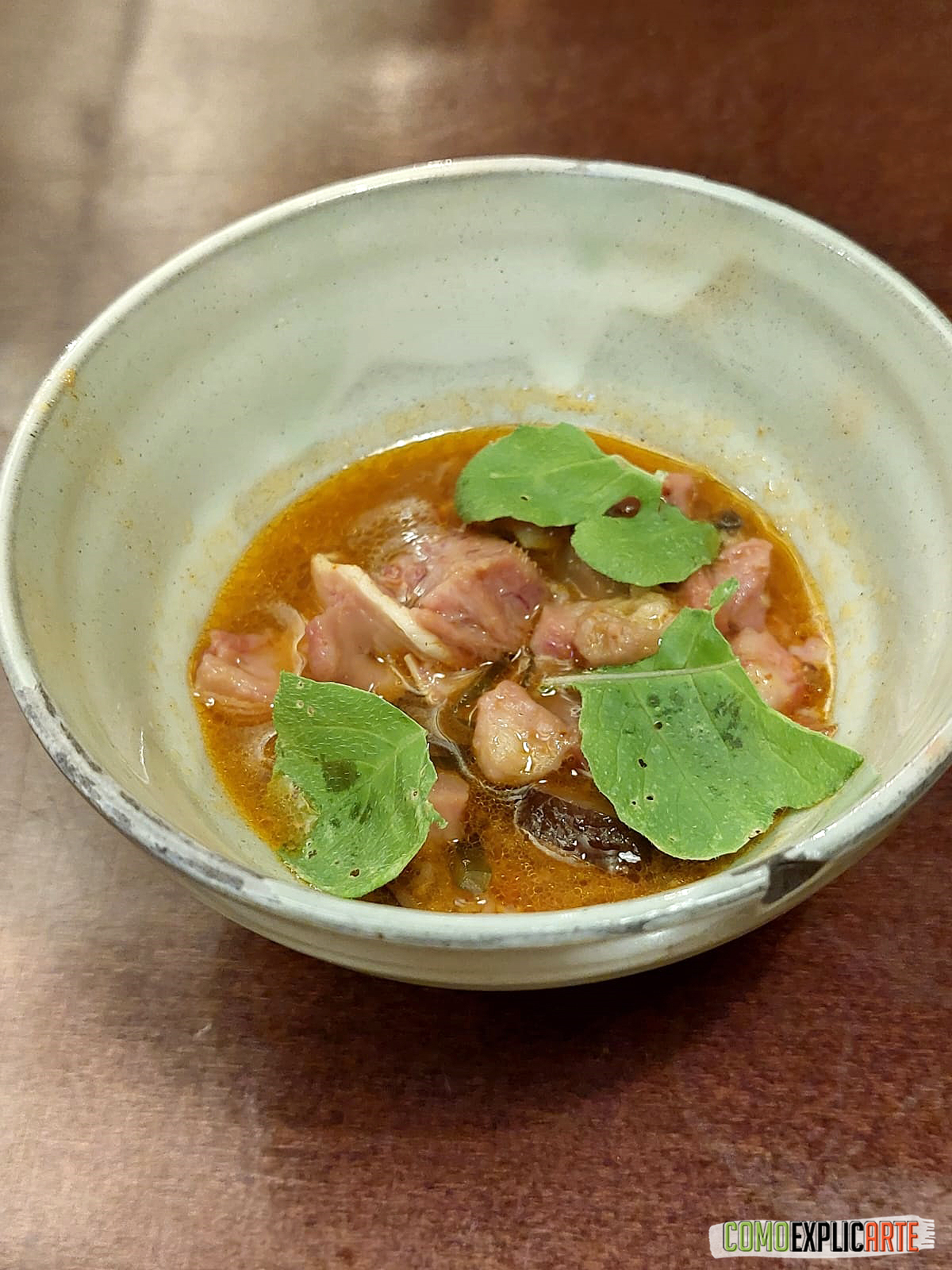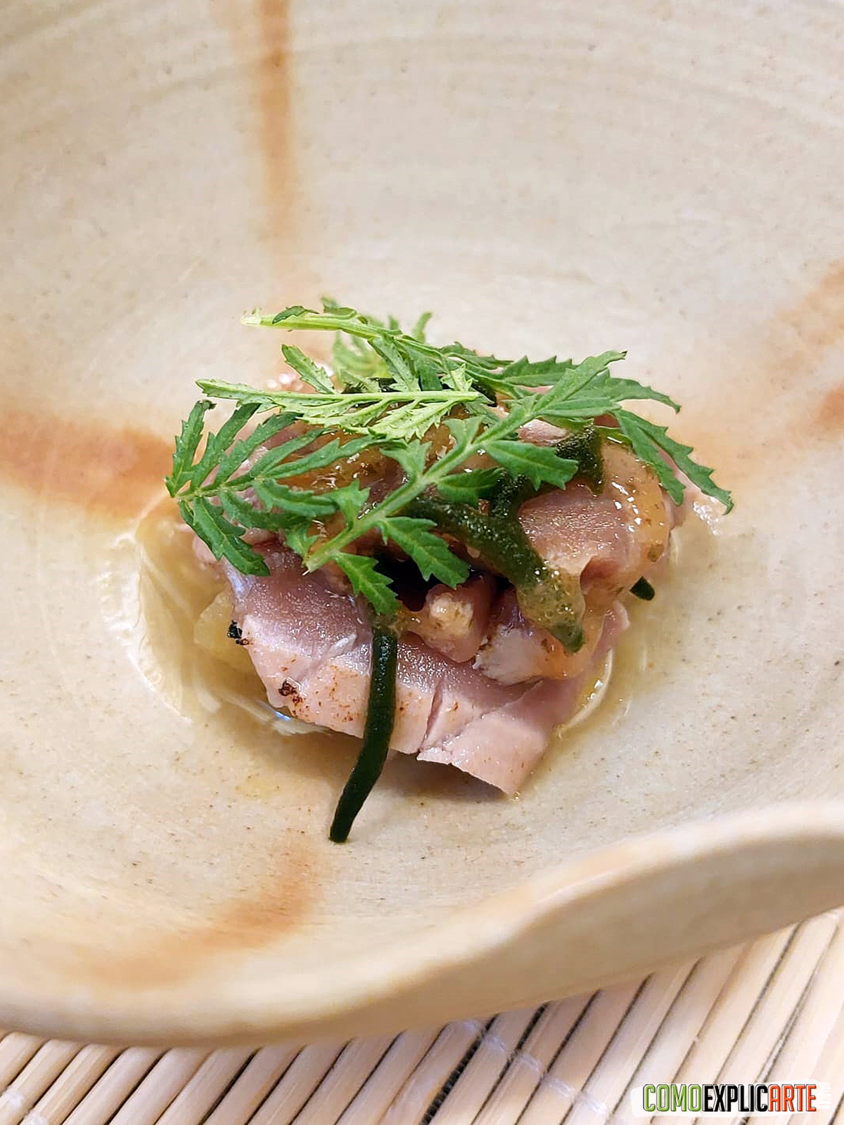 Nosotros elegimos el menú completo (40€) para recorrer el viaje entero por la cocina kaiseki con raíces locales. Comenzamos con un ‘Chawanmushi’ a modo de entrante. Es una mezcla de huevo y dashi que junto con varios ingredientes se cocina al vapor y se sirve en cuenco o taza de té. Típico de Japón pero en este caso adaptado con tomate y sembei.