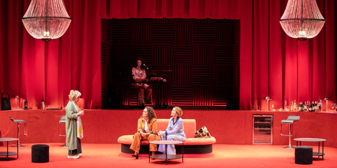 La dirección de David Selvas apuesta por una puesta en escena sobria y eficaz, donde el espacio no cambia, pero sí lo hace su carga emocional. La escenografía de Josep Iglesias y Marc Salicrú, dominada por un rojo envolvente, funciona casi como una caja de resonancia de los conflictos internos de las protagonistas. El sofá central, los elementos de hotel antiguo, la sensación de lugar de paso, refuerzan la idea de tránsito vital: mujeres que miran atrás sin saber muy bien cómo reconciliarse con lo que fueron y lo que son.